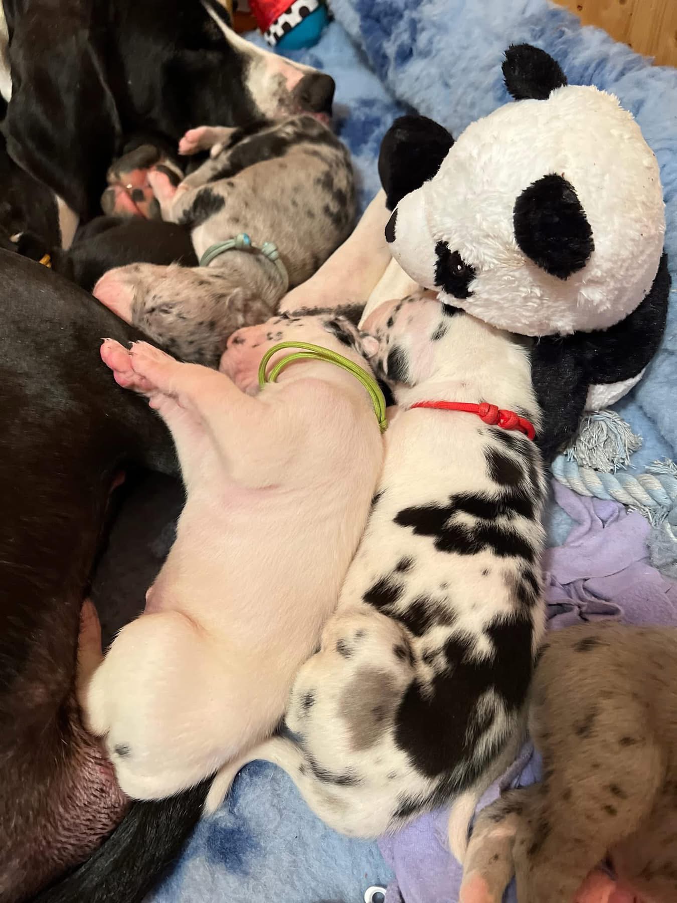 We breed very carefully for health, conformation, good temperament, confidence, and color. All of our Great Danes are AKC registered. The time period from 3-16 weeks is time that breeders and the new family can greatly influence many very important qualities about who the puppy will become. They need to be gently nurtured to learn in a positive, sometimes mildly stressful structured learning environment. This helps to build early confidence. Exposure to various smells, touch, sound, textures, toys, and other animals, are all important in playtime.